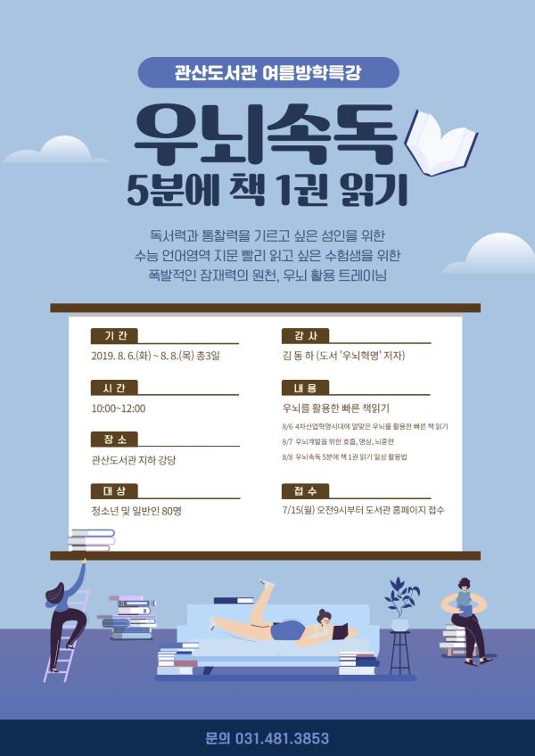 안산시 관산도서관은 부모와 자녀가 함께 참여할 수 있는 여름방학 속독법 특강 ‘우뇌속독 5분에 책 1권 읽기’를 다음달 6일부터 3일 동안 진행한다고 24일 밝혔다.