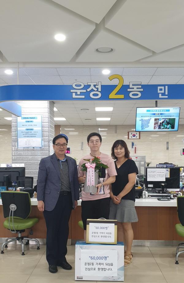 운정2동은 6만 번째 전입 주인공에게 축하의 꽃 화분과 시원한 여름을 보내기 위한 필수품인 냉방제품, 파주한수위 쌀이 축하선물로 전달했다.
