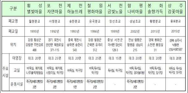 한편 서울시는 2013년부터 도농상생 협력과 서울시민들이 도시를 벗어나 자연을 체험할 수 있도록 8개 지역의 지방 폐교를 활용해 가족캠핑장을 운영하고 있다.