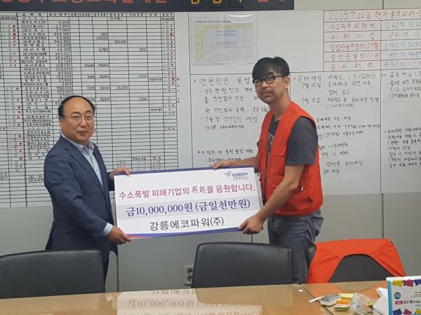 이와 관련해, 강릉시 관내에서 대형 민자발전사업을 추진하고 있는 강릉 에코파워에서는 지역 중소기업들과의 상생협력 차원에서 수소탱크폭발피해대책위원회의 운영에 도움을 주고자 23일 오후 1시, 수소탱크폭발 피해기업 대책위원회사무실을 방문해 10,000,000원의 성금을 전달했다.