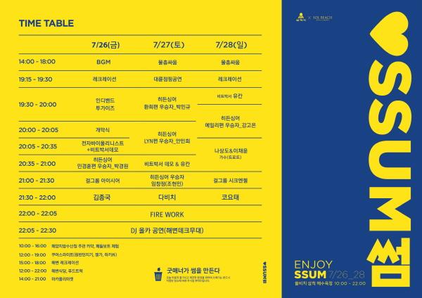 또한, 다양한 인디뮤지션들이 참여하는 ‘해변 낭만 버스킹’은 썸 식당과 함께 축제가 끝난 후에도 오는 8월 25일까지 매 주말 밤 운영해 뜨거운 여름밤의 열기를 계속 이어갈 계획이다.