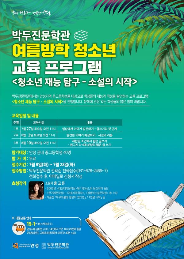 안성시가 오는 27일부터 8월 10일까지 매주 토요일 오전 11시 박두진문학관에서 여름방학 청소년 교육 프로그램 ‘청소년 재능 탐구, 소설의 시작’을 진행한다.
