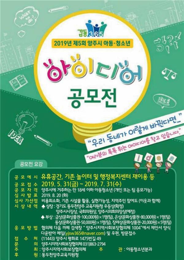 양주시지역사회보장협의체 아동·청소년분과는 오는 31일까지 만 18세 이하의 양주시 아동·청소년들을 대상으로 ‘제5회 양주시 아동·청소년 아이디어 공모전’을 실시한다.