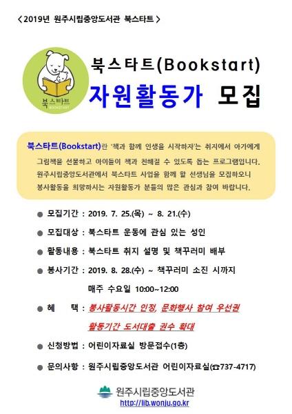 원주시립중앙도서관이 북스타트 활동에 참여할 자원활동가를 오는 25일부터 8월 21일까지 모집한다.