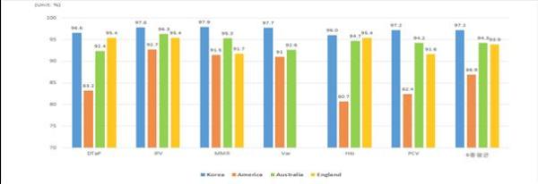 생후 36개월 어린이의 예방접종률을 해외 국가와 비교한 결과를 보면, 우리나라 예방접종률은 평균 97.2%로 외국 예방접종률 대비 평균 3~10%p 높았으며, 소아마비, 홍역 등 비교대상 6종 백신에 대한 전체 접종률도 가장 높게 나타났다.
