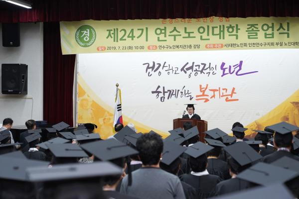사)대한노인회 연수구지회는 지난 23일 ‘제24기 연수노인대학 졸업식’을 연수구노인복지관 3층 대강당에서 개최했다.