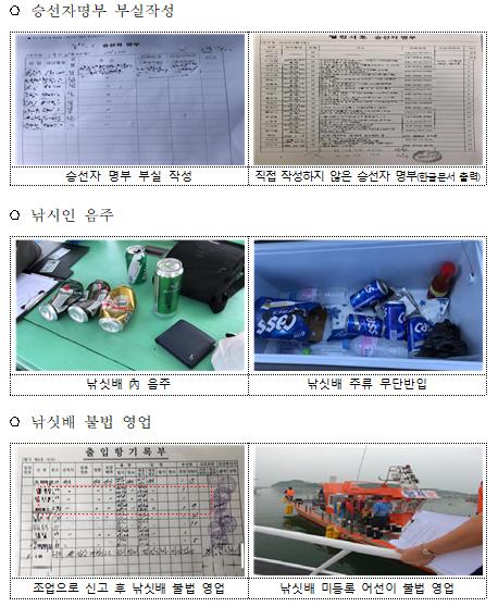 일부 낚시인들은 몰래 주류를 반입해 음주했고, 낚싯배에 ‘신고 확인증’과 ‘승객 준수사항’을 게시하지 않는 등 다수의 안전기준을 위반한 사항도 적발했다.