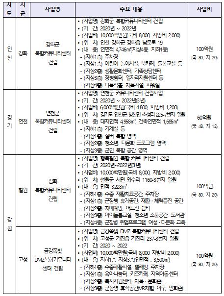 행안부는 2019년부터 2022년까지 12개의 복합커뮤니티센터 조성을 목표로 접경지역에 총 1,200억원을 투자할 계획이며 올해 첫 번째 사업으로 경기도 양주시, 강원도 인제군, 화천군 등 3개 시·군에 사업을 추진 중이다.