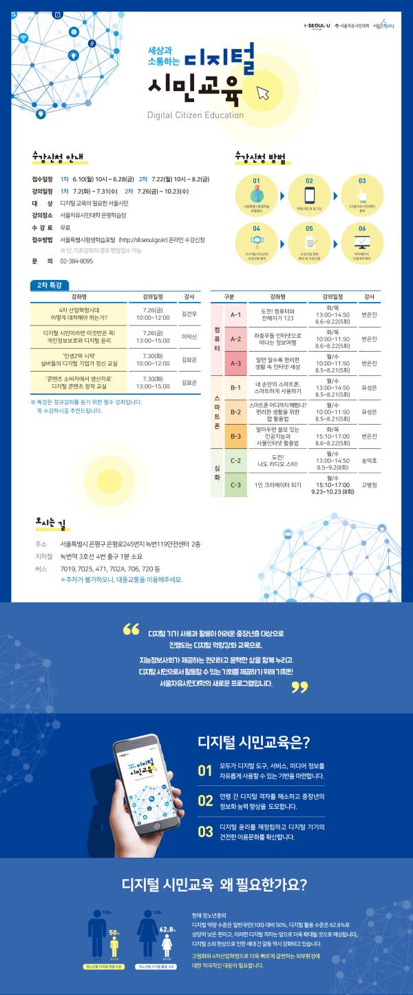 ‘디지털 시민교육’2차 강좌는서울시평생학습포털과 평생학습포털앱을 통해 서울시민이라면 선착순 무료로 신청할 수 있다. 자세한 내용은 서울자유시민대학 은평학습장에 방문하거나 시민대학사업팀으로 문의하면 된다.