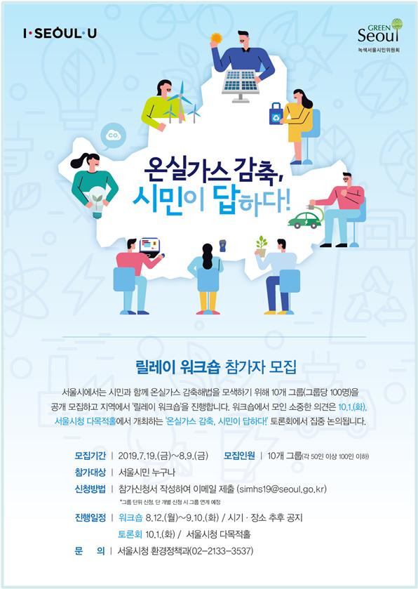 워크숍 참가자는 서울시 홈페이지에서 8월 9일까지 모집한다. 온실가스 감축 문제에 관심 있는 50인 이상 100인 이하의 시민이 모이면 신청 가능하다. 그룹 대표가 참가 신청서를 작성해 이메일로 접수하면 된다. 단, 개별 신청인 경우 지역 등을 고려해 적정한 그룹으로 연계한다.