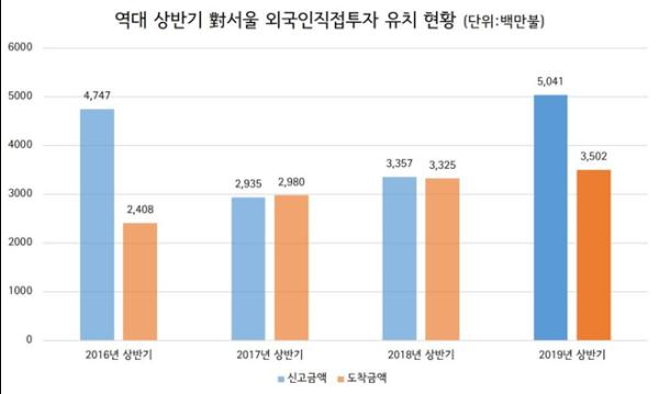 서울시는 2019년 상반기 외국인직접투자 유치 실적이 신고 기준으로 2018년 상반기 실적인 33.6억 달러 대비 50% 증가한 50.4억 달러를 기록했다고 밝혔다. 도착 기준으로도 역대 상반기 실적 최고 수치인 33.3억 달러 대비 5% 증가한 35억 달러를 기록했다.