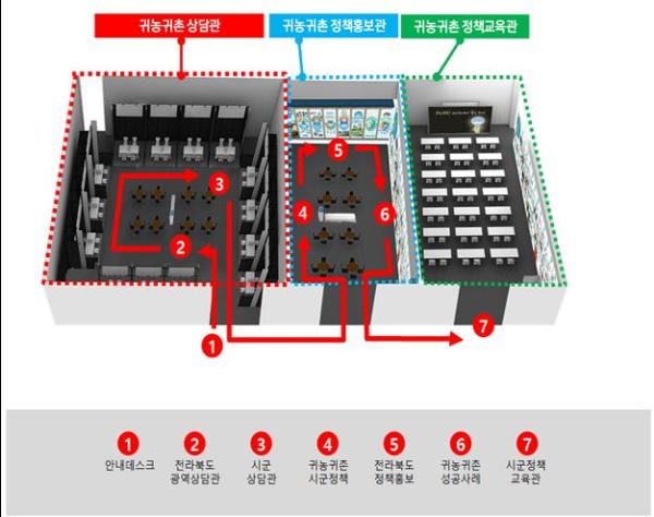 전북도 정책 홍보관에서는 전라북도에서 실시하는 농업·농촌 정책 소개를 통해 농업을 계획하고 준비하는 귀농·귀촌의 최적지로서 도시민들에게 전라북도를 알리고 홍보할 예정이며,시·군 귀농귀촌 홍보관에서는 산재되어 있는 정보를 한자리에서 비교 분석함으로써 귀농귀촌 수요자들에게 맞춤형 정보를 제공할 수 있도록 시군별 대표작물과 귀농귀촌 정책, 임시 거주시설 현황 및 의료·교육·복지환경 등 귀농귀촌 정보를 분석 한 종합정보를 제공한다.