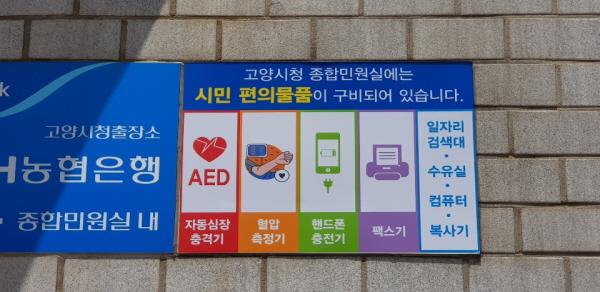 또한 시에서는 1회 추경을 통해 고양시 모든 민원실에 자동심장 충격기, 혈압측정기, 휴대폰 충전기, 팩스 등 시민 편의 물품을 배치해 민원실을 방문하는 모든 시민들이 이용할 수 있게 했다.